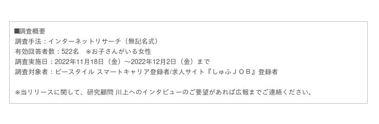 仕事と家庭の両立を希望する主婦・主夫層の実情や本音を探る調査機関『しゅふJOB総研』(運営会社:株式会社ビースタイル ホールディングス 本社:東京都新宿区、代表取締役:三原邦彦)は『優先した時間・したい時間』をテーマに、就労志向のママ層にアンケート調査を行いましたので以下にご報告します。(有効回答数:522件)