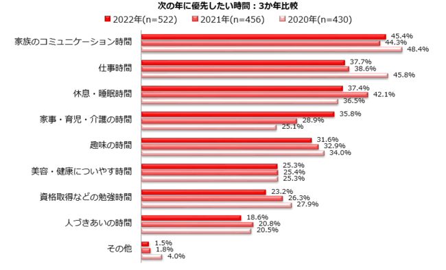 withコロナの中、お子さんがいる女性は何に費やす時間を優先してきたのか。「2022年を振り返って、あなたが優先してきた時間は何でしたか」と尋ねたところ、最も多かったのは「家事・育児・介護の時間」で49.8%でした。3年前は1位だった「家族のコミュニケーション時間」と回答した比率は3年連続で減少しています。一方、「仕事時間」と回答した人の比率は3年連続で増加しました。次に、「2023年にあなたが優先したいと願う時間は何ですか」と尋ねたところ、最も多かったのは45.4%の「家族のコミュニケーション時間」で3年連続1位となっています。また、「家事・育児・介護の時間」と回答した人の比率は3年連続で増加しています。