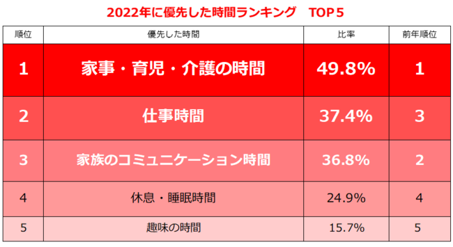 1.2022年に優先した時間 1位「家事・育児・介護の時間」49.8%