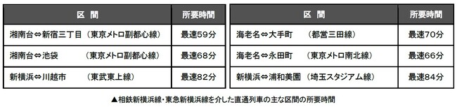 相鉄新横浜線・東急新横浜線は、相鉄本線・相鉄いずみ野線、東急東横線・目黒線に接続し、東京メトロ南北線・副都心線、 都営三田線、埼玉高速鉄道埼玉スタジアム線、東武東上線まで直通運転を行い、7社局14路線を結ぶ広大な鉄道ネットワークを形成することで、所要時間の短縮、乗換回数の減少など交通利便性・速達性が向上します※2。