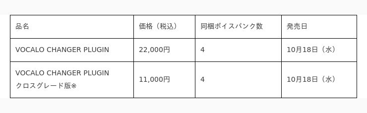 ヤマハ株式会社は、歌唱オーディオデータを「VOCALOID(TM)6」専用のAIボイスバンクの歌声に変換するソフトウェアプラグイン『VOCALO CHANGER PLUGIN(ボカロチェンジャー・プラグイン)』を10月18日(水)より発売します。本製品はダウンロード専用となっており、ボーカロイド公式ショップ(https://www.vocaloid.com/)より購入できます。また、VOCALOID3以降のソフトウェア購入者を対象としたクロスグレード版もご用意しました。