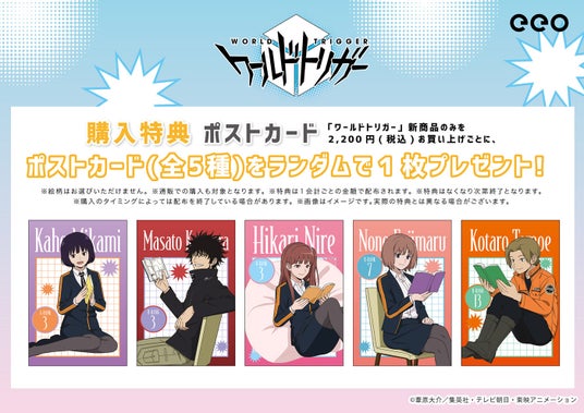 『ワールドトリガー』新商品のみを2,200円(税込)お買い上げごとに、ポストカード(全5種)をランダムで1枚プレゼント!