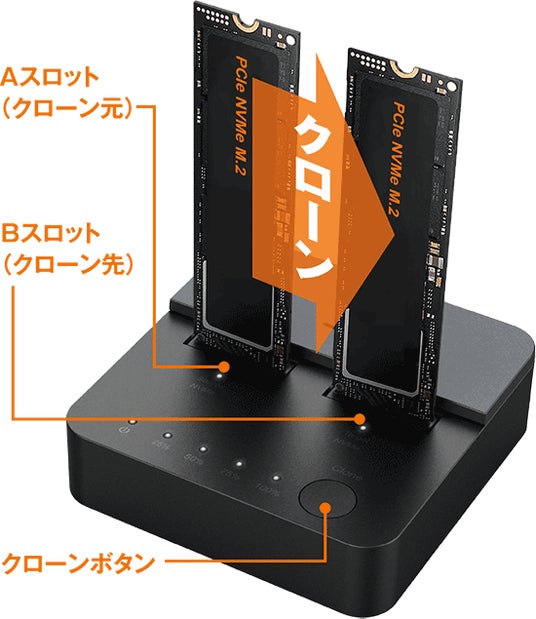 ドライブのコピー機能を搭載しており、2台のSSDをセットしてクローンボタンを押すだけで簡単にコピーが可能です。