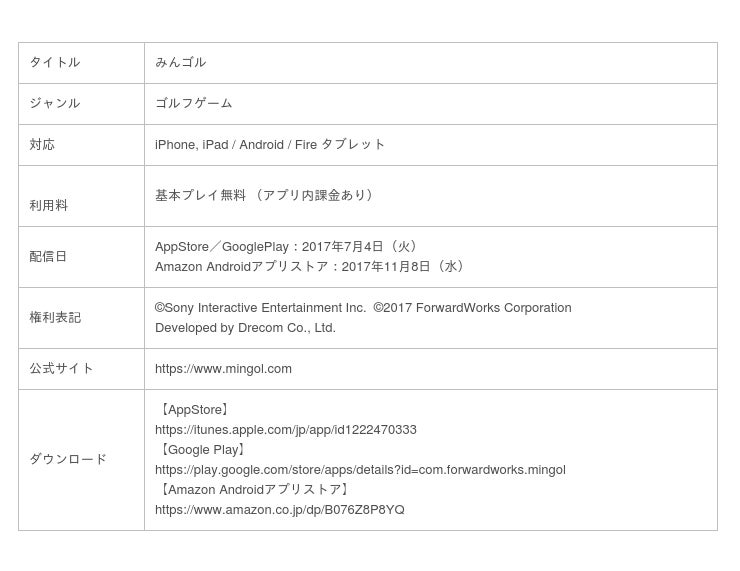 『みんゴル』は、「プレイステーション」を代表する作品のひとつ「みんなのGOLF」シリーズの“誰でも簡単にゴルフゲームを楽しめる”というコンセプトを、スマートフォンの特性や、プレイスタイルに合わせて最適化し、誰もが、いつでもどこでも、爽快ショットで手軽にゴルフゲームをお楽しみいただけます。