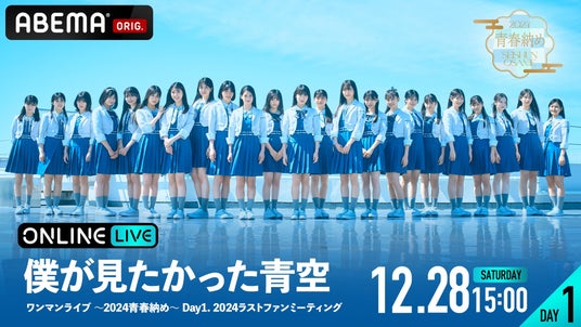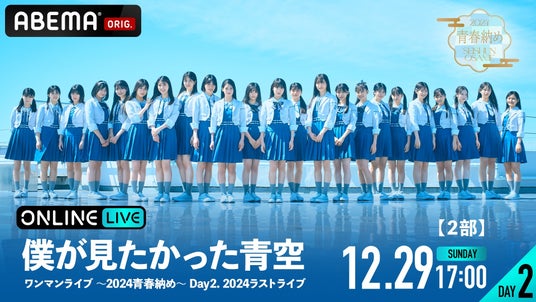 このたび独占生配信が決定した僕が見たかった青空による『ワンマンライブ~2024青春納め~』では、DAY1にてファンミーティング、DAY2にてライブをお届け。2024年12月28日(土)15時からお届けするDAY1『ワンマンライブ~2024青春納め~2024ラストファンミーティング』では、メンバーが様々な企画に体当たりで挑戦するファンミ―ティングを「ABEMA」にて初配信。今年お世話になったスペシャルゲストも…!?12月29日(日)は、『ワンマンライブ~2024青春納め~2024ラストライブ』を開催。12時からお届けする第1部、17時よりお届けする第2部は、それぞれ異なるセットリストにて開催し、第1部・第2部にて僕が見たかった青空の楽曲を全曲披露します。