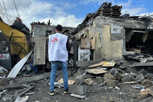 ウクライナ・ドネツク州で、攻撃により破壊されたオフィスを確認するスタッフ=2024年4月5日 (C) Yuliia Trofimova/MSF