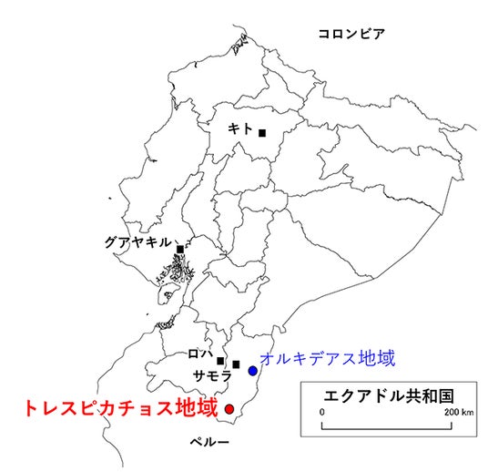 - 探鉱地域トレスピカチョス(Tres Picachos)地域は、アンデス山脈東部にあり、エクアドル共和国の首都キト(Quito)から南約450キロメートル、エクアドル南部の主要都市ロハ(Loja)から南約80キロメートルに位置する。