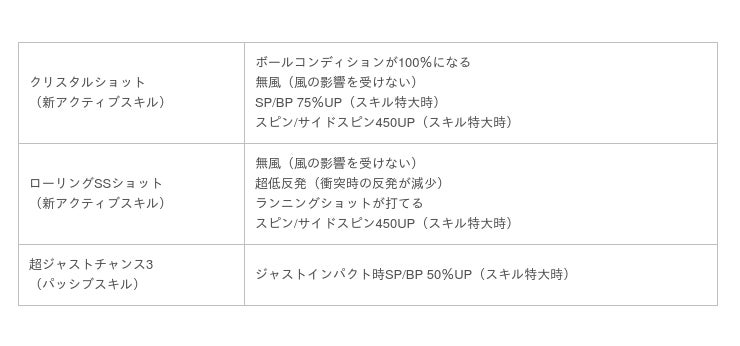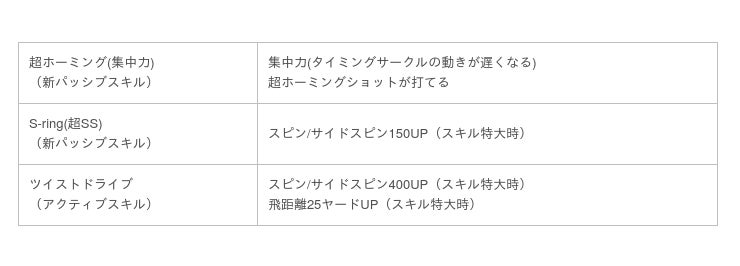 今回は、「S-ring」シリーズから、ギアガチャには最大パワーが530かつ、新アクティブスキル「クリスタルショット」「ローリングSSショット」に加え、パッシブスキル「超ジャストチャンス3」を搭載した新ギア「スリングSSクリスタルクラブ」が登場いたします。ウェアガチャにも新パッシブスキル「超ホーミング(集中力)」「S-ring(超SS)」に加え、アクティブスキル「ツイストドライブ」など、複数スキルを搭載した新作ウェアが登場。この新作ウェアは「10回プレイ」2・4・6・8セット目で確定となります。ぜひ、ご参加ください!