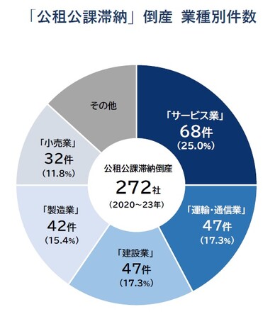 2020~23年間に発生した「公租公課滞納」倒産272件を業種別にみると、最も多いのは「サービス業」の68件で、特にソフトウェア開発などの業種で多く発生した。トラック運送などの「運輸・通信業」や「建設業」(47件)、「製造業」(42件)なども40件を上回る水準だった。