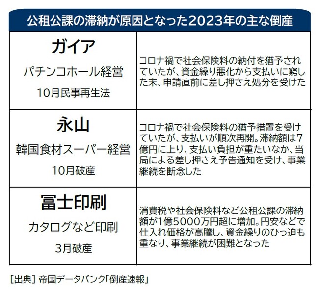 公租公課のうち、特に企業にとって負担の重い社会保険料は最長3年にわたる納付猶予措置が設けられ、企業の資金繰りを支えてきた。ただ、ポストコロナに向けて企業活動が正常化するなかで特例措置も順次縮小、年金事務所による厚生年金保険料などの差し押さえ件数は22年度に2万7784事業所と、前年度の4倍に達し、社会保険料などの滞納者に対する差し押さえ処分が本格化している。そのため、コロナ禍で猶予された社会保険料の納付ができず、法的整理直前に差し押さえ処分を受けたパチンコホール大手「ガイア」や、業績不振のなかで消費税と社会保険料の支払いに窮した、韓国食材スーパーや免税店運営の「永山」など、猶予期間中に業績を立て直すことができなかった企業の倒産が相次いだ。
