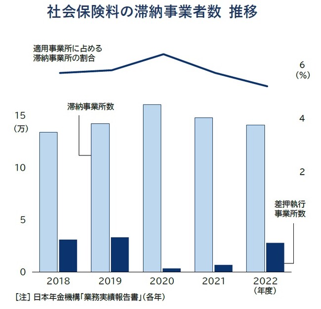 日本年金機構によると、厚生年金保険を含む社会保険料を滞納している事業所は、22年度末時点で14万811事業所に上り、適用事業所全体に占める割合は5.2%を占めた。前年度に比べて滞納事業所数は減少したものの、依然として多くの企業が納付に苦慮する状態が続いている。