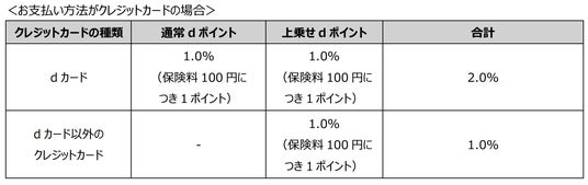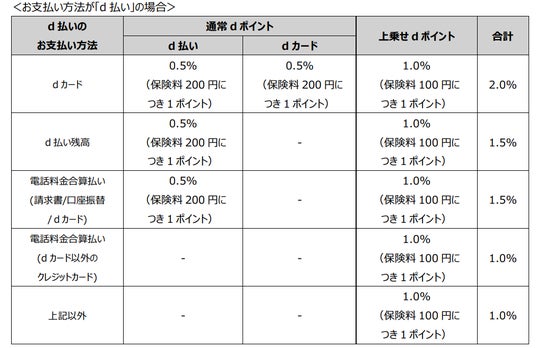 保険料(地震保険料とdポイント利用分を除く)に対して、通常のdポイントに加えて1.0%のdポイントを上乗せして進呈します。これにより、「d払い」または「dカード」でお支払いの場合は、合計して最大2.0%のdポイントがたまります。