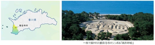 観音寺市は、香川県の西端、瀬戸内海に面した西讃地域の中心都市で四国のほぼ真ん中に位置しています。市域には三豊平野や有明浜が広がり、南側には讃岐山脈の雲辺寺山があり、山・海・平野が調和した豊かな自然環境に恵まれています。琴弾公園内の「銭形砂絵(寛永通宝)」をはじめ、四国霊場第68番札所「神恵院」、第69番札所「観音寺」などの歴史・文化資源も有しています。これらの地域資源や産業を背景に、観音寺市では多様な分野において地域の特性を活かした事業を展開しています。
