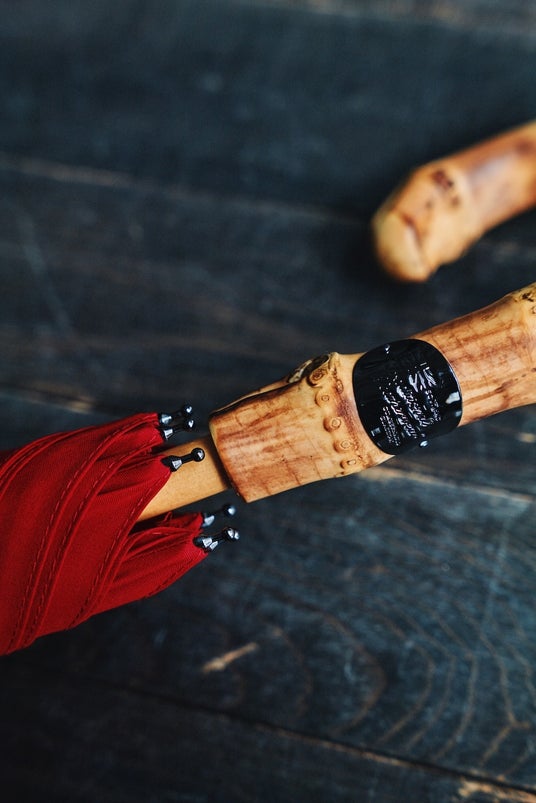 バンブーの持ち手に配されたプレートや、チップ(露先)、バンドの「Y's」ボタン、開いた時に中に見える傘骨など、全ての金属パーツが黒で表現されている。プレートとボタンそれぞれに入る「Traditional Weatherwear」と「Y's」のロゴが象徴的に両者のコラボレーションを証明する。