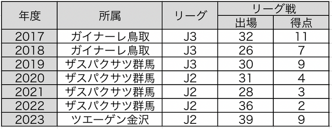 霞SC - 南SC - サンフレッチェ常石 - 米子北高 - 城西国際大 - ガイナーレ鳥取 - ザスパクサツ群馬 - ツエーゲン金沢