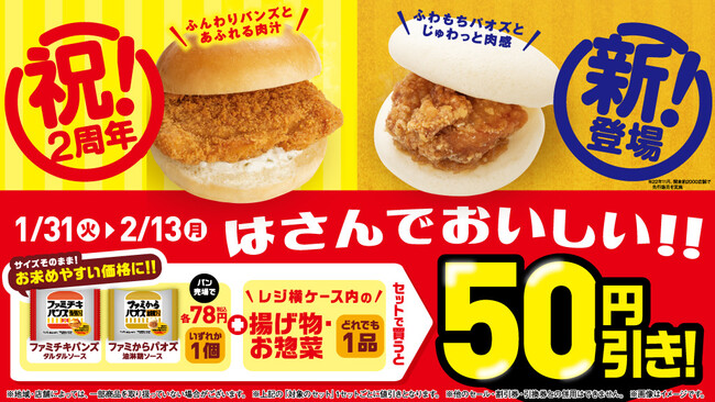 「ファミチキバンズ」2周年を記念して、商品仕様はそのままで「ファミチキバンズ(タルタルソース)」を10円値下げし、「ファミからパオズ(油淋鶏ソース)」と同じ78円(税込)で販売いたします。
