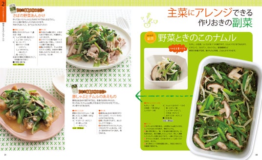 作っておくとそのまま主菜にもアレンジして使える作りおきの副菜や、作りおきできる主菜・副菜、作っておくと便利な塩もみ野菜のレシピも紹介しています。