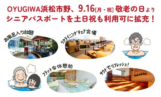 株式会社イオンファンタジー(本社:千葉県千葉市、代表取締役社長:藤原徳也)が運営する温浴施設「OYUGIWA 浜松市野」(静岡県浜松市)は、2024年9月16日(月・祝)の敬老の日より、65歳以上対象の定額サービス「シニアパスポート」や朝食メニューの充実など、シニアのお客さまに嬉しいサービスを拡大いたします。