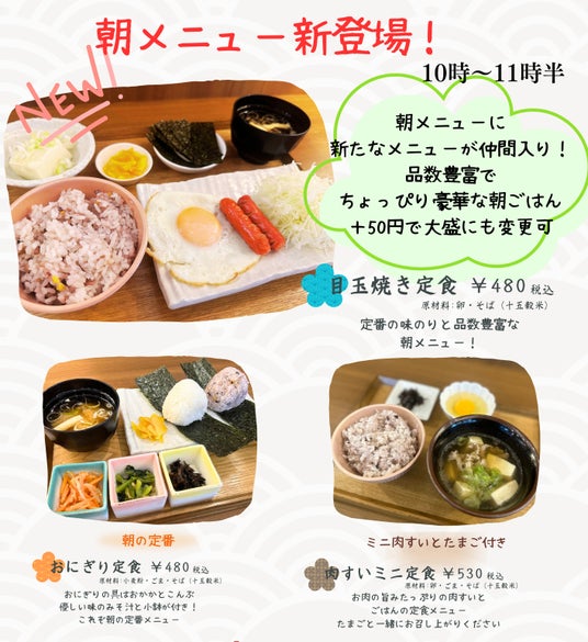 また、レストランでは朝10時から11時30分まで限定の朝食メニューに新メニューを追加。「目玉焼き定食」、「肉すいミニ定食」など、品数豊富なおかずと美味しくヘルシーな十五穀米を楽しめる朝定食がさらに増えました。