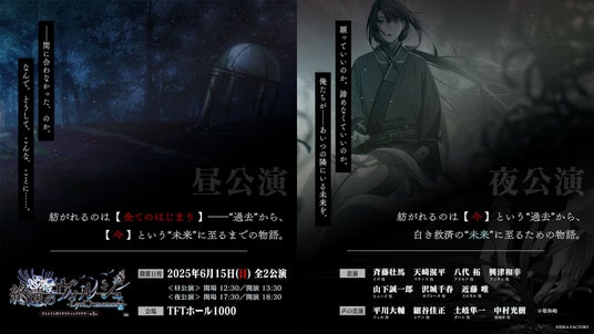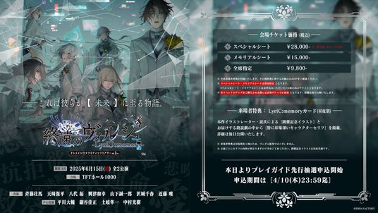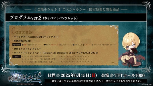 アイディアファクトリー株式会社(代表取締役社長:佐藤 嘉晃/所在地:東京都豊島区)の女性向けゲームブランド「オトメイト」は、2025年6月15日(日)に開催するオトメイトドラマティックシアターvol.03re「終遠のヴィルシュ -LyriC:memory-」の物販情報・プログラムver.2(本イベント公式パンフレット)の内容を公開いたしました。