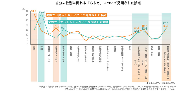 自分の性別について「男/女ならこうすべき」という内容を見聞きした接点を聞くと、男性は「父親」、女性は「母親」がトップでいずれも3割以上。一方、子を持つ人について「自分の子供に対して、なるべく『男だから』『女だから』などと言わないようにしている」と回答した人は7割弱にのぼり、次の世代に「らしさ」を押し付けない意識が見られる。