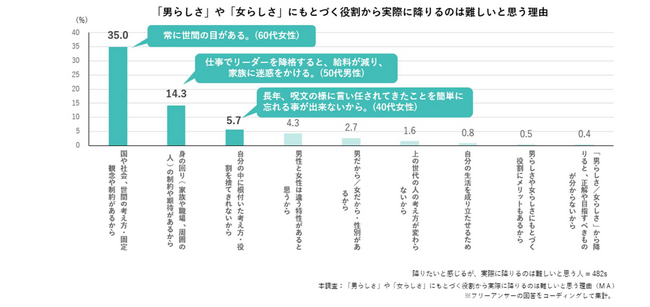 「男らしさ」や「女らしさ」にもとづく役割については、「降りたいが実際に降りるのは難しい」と感じる人が全体で4割。難しいと感じる理由は「社会や世間の考え方」「身の回りの人・環境の期待や制約」「自分の中に根付いた考え方を捨てきれない」が上位を占める結果に。