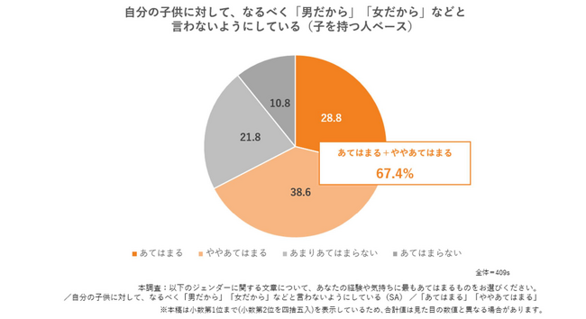 子を持つ人について「自分の子供に対して、なるべく『男だから』『女だから』などと言わないようにしている」と回答した人は7割弱にのぼり、次の世代に「らしさ」を押し付けない意識が見られる。