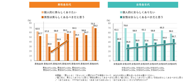 調査からは男女ともに性別による「らしさ」によって苦しむ人が見られ、社会や周囲の押し付けによって窮屈な思いをしている人がいることもわかりました。一方で、そのような「らしさ」の押し付けを次の世代に残さないようにしている意識も子を持つ生活者においてみられており、今後の変化の兆しがうかがえる結果となりました。