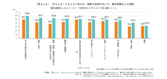 性別にもとづく「らしさ」によってイヤな経験をした人に、具体的にイヤな経験をした場面についてきいたところ、全体的に女性の方が高い結果となった。女性で高いのは「日ごろの所作や言葉遣い」「家事・育児」「結婚・家庭」、男性で高いのは「日ごろの所作や言葉遣い」「仕事」「恋愛・パートナーシップ」となった。またイヤな経験の具体的な内容を自由回答できいたところ、主に男性では強くいなければならない・経済力を期待される、女性では家事や育児をしなければならない・愛嬌の良さや見た目の管理をしなければならない、などの回答が多く見られた。