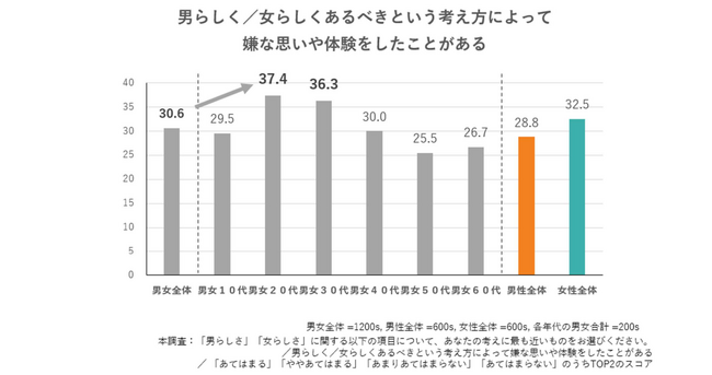 「男らしく/女らしくあるべきという考え方でイヤな思いをしたことがある」人は全体の3割。