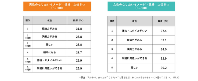 男女全体において「男らしさ」と特に結びつくイメージ・性格は「強い・タフである」「頼りになる」「勇敢である」、「女らしさ」と特に結びつくイメージ・性格は「優しい」「周囲に気遣いができる」「見た目に気をつかう」と、両者の傾向に大きな違いが見られた。一方で、自分がなりたいイメージ・性格をきいたところ、男女ともに「男らしさ」「女らしさ」と結びつく項目にあてはまらないものも上位にあがった。