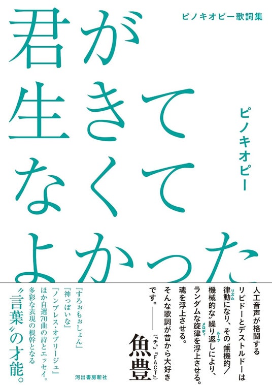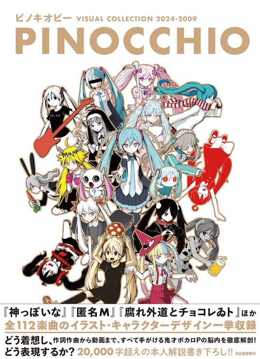 株式会社河出書房新社(本社:東京都新宿区/代表取締役:小野寺優)は、音楽クリエイター・ピノキオピー初の書籍『ピノキオピー歌詞集 君が生きてなくてよかった』(1,700円+税)、『ピノキオピー VISUAL COLLECTION 2024-2009 PINOCCHIO』(2,900円+税)、『ピノキオピー歌詞集&画集 ANNIVERSARY BOX』(5,400円+税)を、2024年10月29日に発売いたします。