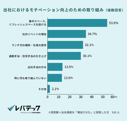 出社におけるモチベーション向上のための取り組みとしては「集中スペース、リフレッシュスペースを設ける(53.9%)」や「社内イベントの増加(34.7%)」が上位に挙がりました。