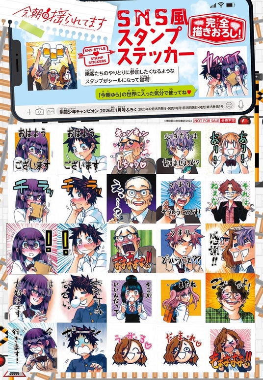 株式会社秋田書店(所在地:東京都文京区、代表取締役社長:山口徳二)は、発行している漫画誌『別冊少年チャンピオン』(編集長:小口太郎)12月15日(月)発売の新年1月号にて、表紙&巻頭カラーに『今朝も揺られてます』(著: 増田英二)を掲載。付録では、『今朝も揺られてます』SNS風スタンプステッカーが登場することをお知らせいたします。