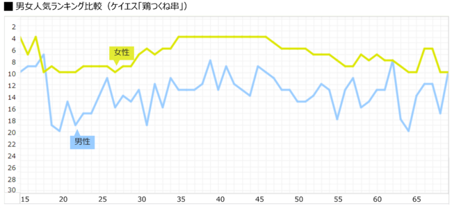 上記は、男女総合購買ランキング6位のケイエス「鶏つくね串」の性別ごとの年齢別購買ランキングを表したものです。(ケイエス「鶏つくね串」は女性総合購買ランキングで6位、男性総合購買ランキングで12位)