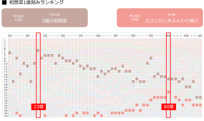 続いて、副菜系のおかずに焦点を当て、総合ランキング12位の日本水産「3種の和惣菜」、29位の味の素「えびとひじきふんわり揚げ」の年齢別購買ランキングを読み解きます。