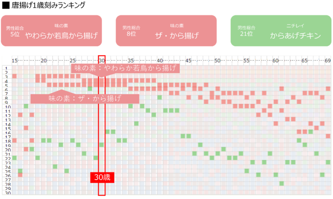 性別ごとに年齢別ランキングを比較してみると、大ぶりサイズの唐揚げは男性人気が高く、お弁当用の唐揚げは、女性人気が高い結果となりました。