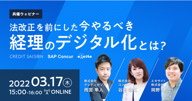 エキサイト株式会社(所在地:東京都港区、代表取締役社長:西條晋一、以下「エキサイト」)は、2022年3月17日(木)15:00~16:00に株式会社クレディセゾンの雨宮隼人氏、株式会社コンカーの谷田咲江氏を迎え、「法改正を前にした、今やるべき経理のデジタル化とは?」をテーマに参加費無料のウェビナーを開催することをお知らせします。