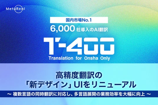 株式会社メタリアルグループで、国内市場No.1※のAI翻訳サービスを開発・提供する株式会社ロゼッタ(代表取締役:五石 順一)は、2026年1月、高精度産業翻訳AI「T-4OO(ティーフォーオーオー)」において、高精度翻訳(旧生成AI翻訳)機能の「新デザイン」UIをリニューアルしたことをお知らせします。