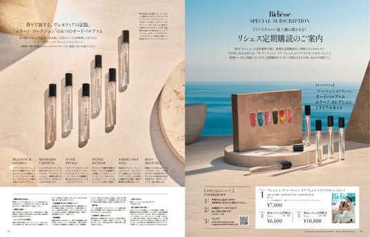 毎号スペシャルなアイテムをセットにして発売する『リシェス』の定期購読。今回のセットアイテムは、ヴェネツィア発のフレグランスブランド「ザ マーチャン オブ ヴェニス」の「ムラーノ コレクション」をミニボトルに詰めたトライアルキットです。6種類の魅惑の香りを、雑誌(1年・4冊)と共にお楽しみください。