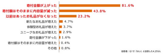 - 2023年10月の制度改正後、半数が「変化を感じていない(50.5%)」と回答しました。反対に「変化を感じている」と回答した人へどのような変化を感じるか尋ねたところ、「寄付金額が上がった(81.6%)」が最も多く「寄付額はそのままに内容量が減った(43.8%)」「以前はあったお礼品がなくなった(23.2%)」が続く一方で、「体験型お礼品が増えた(3.7%)」「ユニークなお礼品が増えた(2.9%)」など、お礼品ラインナップに変化を感じる寄付者も見られました。