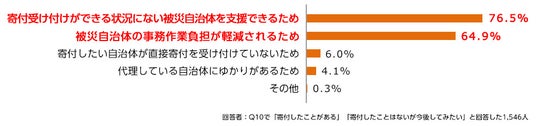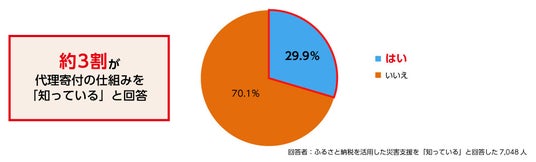 - 「代理寄付」の仕組みについて29.9%が知っていると回答。「代理寄付をしたことがある」または「今後してみたい」と回答した人へ理由を尋ねたところ、「寄付受け付けができる状況にない被災自治体を支援できるため(76.5%)」や「被災自治体の事務作業負担が軽減されるため(64.9%)」が多く、被災地の状況を思い、代理寄付に関心を寄せている人が多いことが分かりました。