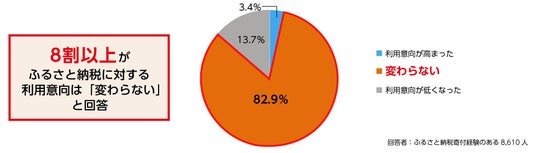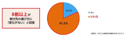 - 制度改正後のふるさと納税に対する利用意向について聞いたところ、82.9%が「変わらない」と回答。寄付先の選び方についても81.5%が「変化がない」と回答し、ふるさと納税への利用意向や寄付先の選び方への影響は大きくなかったことが推測されます。