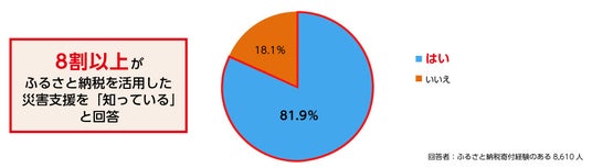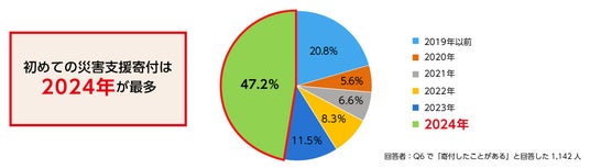 - ふるさと納税を活用して被災地の支援ができることを「知っている」と回答した人は81.9%にのぼり、ふるさと納税による災害支援寄付の認知が広がっていることが分かりました。また、災害支援寄付をしたことがあると回答した人のうち、初めて寄付した年は「2024年(47.2%)」が最も多く約半数を占める結果となりました。2024年1月に発生した能登半島地震をきっかけに、ふるさと納税を活用した「新たな地域貢献のかたち」が浸透したことがうかがえます。