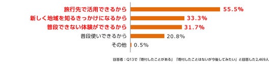 - 体験型のお礼品や現地決済型のお礼品に「寄付をしたことがある」または「今後してみたい」と回答した人へ理由を尋ねると、「旅行先で利用できるから(55.5%)」が最も多く、次いで「新しく地域を知るきっかけになるから(33.3%)」「普段できない体験ができるから(31.7%)」などの理由が挙げられました。旅行先での活用ニーズの高さに加え、ふるさと納税をきっかけとした地域の新しい魅力の発見や貴重な体験機会の創出など、多様化する体験型お礼品に対し、さまざまな魅力を感じていることが分かりました。
