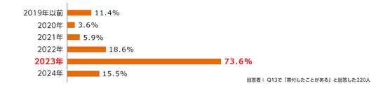 - 体験型お礼品や現地決済型のお礼品に「寄付したことがある」と回答した人のうち、申込んだ年として最も多かったのは2023年(73.6%)で、2022年(18.6%)と比べると約4倍に急増していることが分かりました。行動規制の緩和による、旅行需要の高まりが背景にあると考えられます。