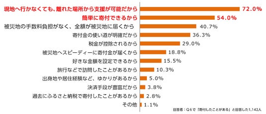 - 災害支援の寄付をしたことがあると回答した人へ理由を尋ねたところ、「現地へ行かなくても、離れた場所から支援が可能だから(72.0%)」が最も多く、次いで「簡単に寄付できるから(54.0%)」という結果となりました。遠くにいても簡単に支援できる方法として、ふるさと納税制度を活用している人が多いことがうかがえます。
