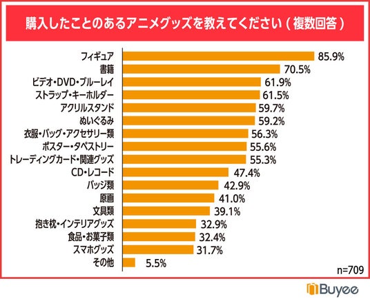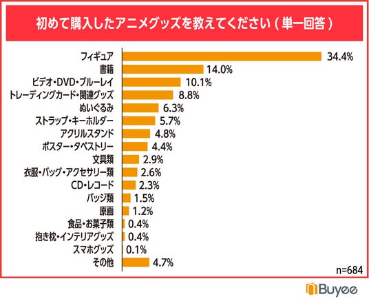 初めて購入したアニメグッズは「フィギュア」が34.4%と突出、「購入したことのあるアニメグッズ」は書籍など9分野で過半数超と初回購入後は様々な分野の商品を購入