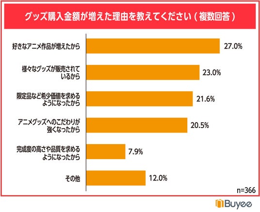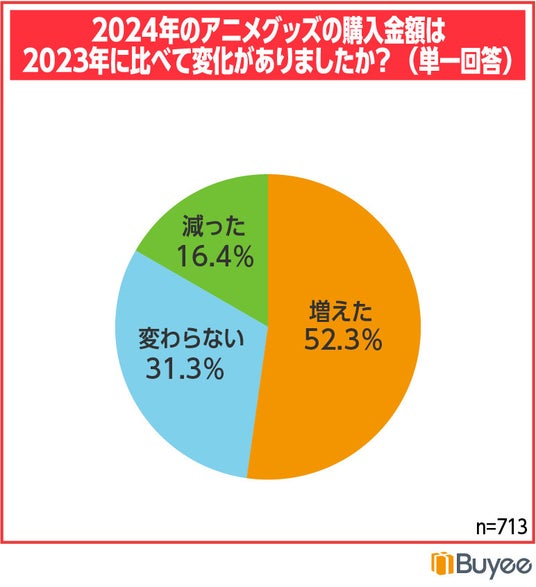 2024年のアニメグッズの購入金額は昨対比で「増えた」52.3%、理由は「好きなアニメ作品が増えたから」27.0%