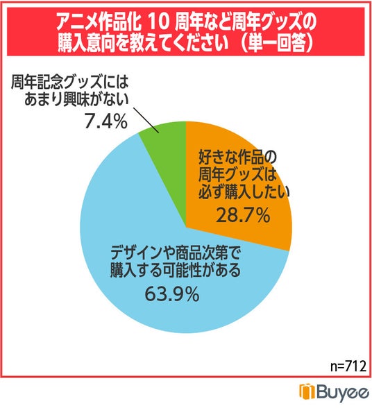 好きな日本アニメの周年グッズの購入意向をきいたところ「デザインや商品次第で購入する可能性がある」が63.9%%で「必ず購入したい」28.7%とあわせて92.6%が「購入する可能性がある」と回答しました。また、好きなアニメキャラクターの誕生日記念グッズについても同79.4%が「購入する可能性がある」と回答しています。アニメキャラクターの誕生日記念グッズより周年記念グッズの方が、購入意向の高いことがわかる結果となりました。